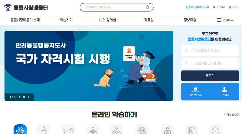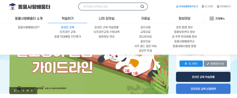 동물사랑배움터의 교육을 수강하기 위해서는 회원 가입 후 '학습하기' 메뉴에서 '온라인 교육'을 선택하면 된다. 관심 있는 영상을 선택한 뒤 수강 신청을 하면 즉시 학습할 수 있다.