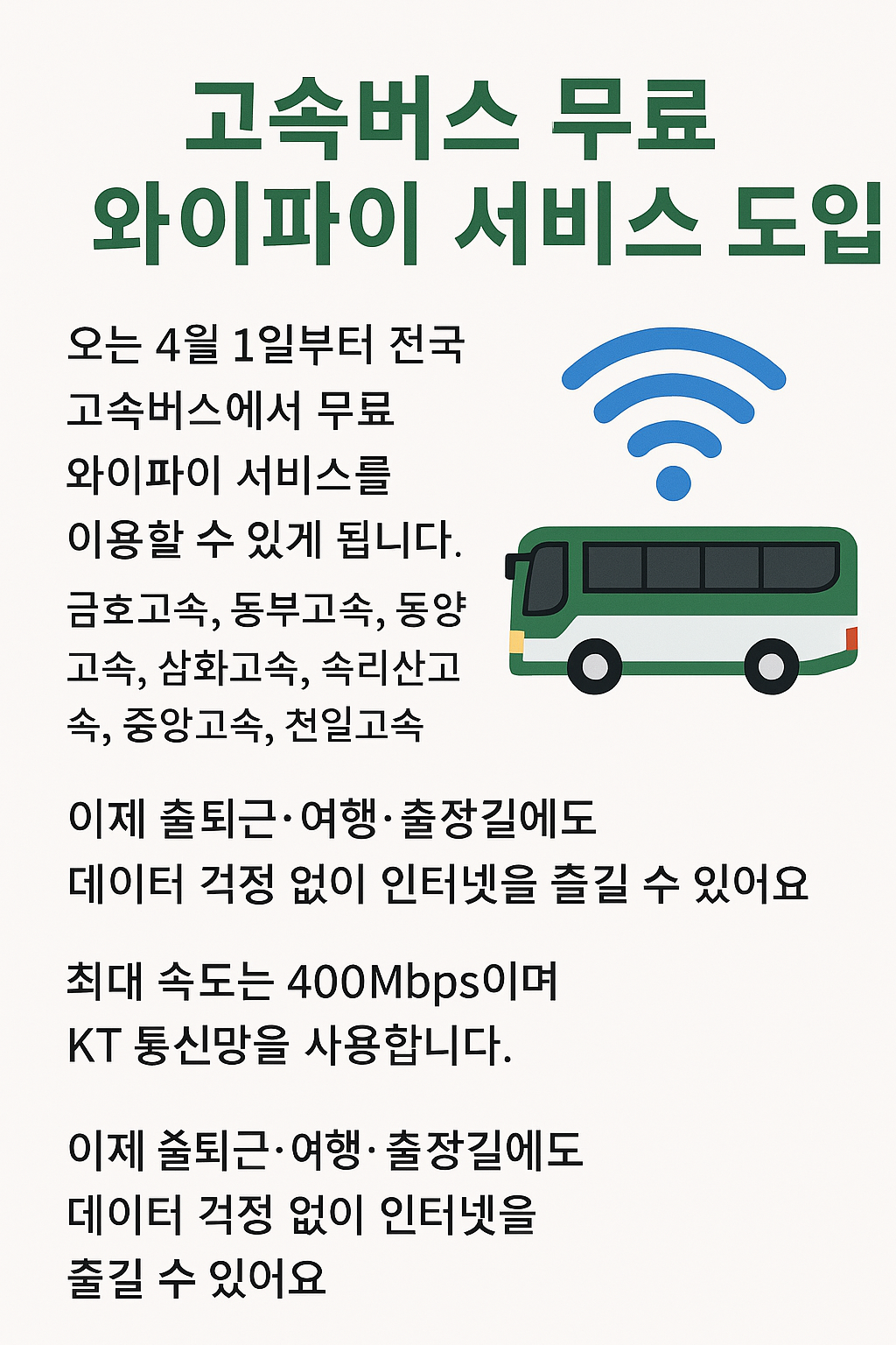 전국 고속버스 무료 와이파이 서비스 도입! 데이터 걱정 없이 편리한 여행을 즐기세요
